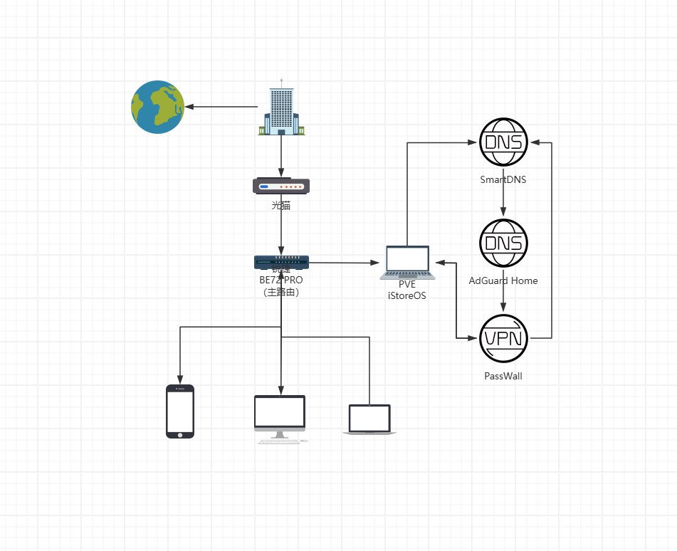 近期总是发现在家庭网络环境有一些需要通过代理的站点无法访问,尤其是在访问境外CDN站点时,经由CDN的图片是无法被正确加载的,考虑到我自建了DNS服务器,首先想到的是DNS环境所导致的链接失效,但经过多种方法逐步排除后,发现问题源头并非DNS,而是由于旁路由开启IPV6所导致的问题。如果你的网络也存在相同情况,可以先按照以下内容尝试处理。网络环境概况运行流程大概如上图内容,入户网络经过光猫,桥接到