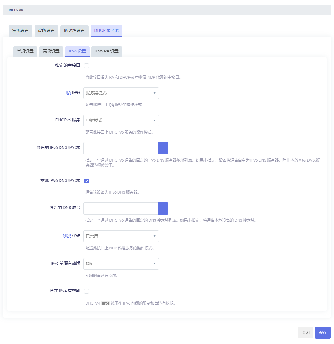 解决方法也颇为简单,仅需要在Openwrt开启IPV6的前提下,进入LAN接口配置——DHCP服务器——IPV6设置,将其中的“RA服务”选择“服务器模式”,并且勾选“本地IPV6 DNS服务器”,“DHCPv6服务"保持默认的”中继模式,确保仍由主路由下发。