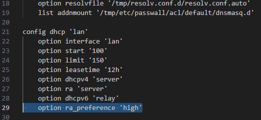 OpenWRT的RA优先级设置在/etc/config/dhcp文件中,需要在config dhcp lan下添加option ra_preference 'high',从而提高OpenWRT的RA优先级,使得客户端设备优先走OpenWRT。